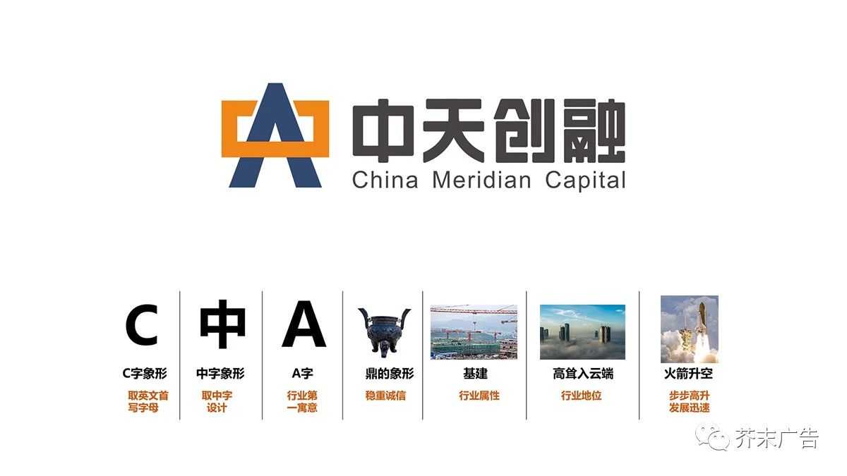 中天创融的logo设计从字母C、A及“中”字等具象符号的基础上出发,进行变形与艺术化处理,并创造性地融入了“鼎”与“直入云霄”的价值性联想概念,